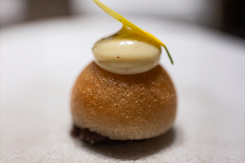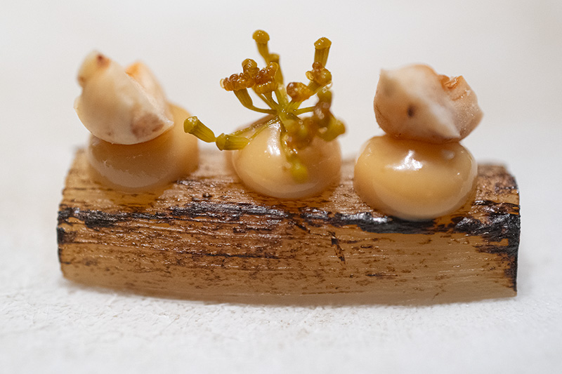Hier sind wir gut aufgehoben und werden sogleich mit einem prickelnden Blanc de Blancs Sekt vom Gut Hermannsberg begrüßt. Dazu feiert die Küche eine »Hommage an die rheinhessische Heimat«: es gibt den Geschmack von Trauben, Zwiebelkuchen, Reh, Wacholder, Spargel, Fenchel und Haselnüssen in unterschiedlichen Texturen als mundgerechte, bezaubernde Miniaturen zu verkosten. Das erweckt bereits unser größtes Entzücken!
