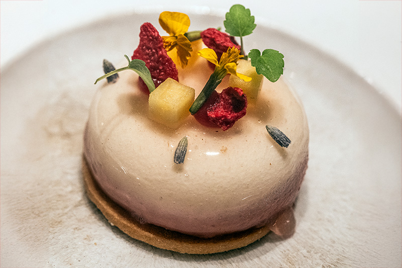 Unsere Sommelière zeigt einen eigenen, überraschenden, guten Stil. Nun hält sie noch die Riesling Spätlese 2024 Rothenberg vom Weingut Gunderloch für uns bereit. Die überzeugt mit zurückhaltender, angenehmer Süße. Denn nun kommen die Desserts. Aus Joghurt- und Himbeermousse strahlt uns da hochglänzend unter Pfirsichgelee auf köstlichem Mürbeteig ein kleines Küchlein entgegen. Tagetes, Himbeeren und vor allem Lavendel leisten ihren blütenparfümierten Beitrag. Himmlisch!