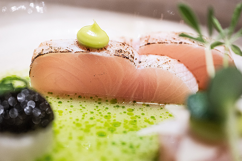 Weiter geht es mit einem lauwarmen Roggen-Dinkel-Sauerteigbrot von der Bäckerei Vetter, dem noch die feine Nussbutter und der kräftige Spundekäs‘ zur Seite stehen. Dazu schenkt uns Maike bereits den Riesling Halenberg 2020 aus der Großen Lage vom Weingut Emrich-Schönleber ein. Der hat leicht erdige, mineralische Töne, man schmeckt ganz leicht das Holz. Er gesellt sich wunderbar zum nächsten Gang, dem Sashimi-Kingfish – als Scheiben und als Tatar – (dry-aged), der, kombiniert mit grünem Apfel, Kohlrabi und mit Schnittlauch (Öl und Mayonnaise) in einem herrlichen Sud, seinen Schwerpunkt durch ein großes Löffelchen Kaviar vom sibirischen Stör findet.