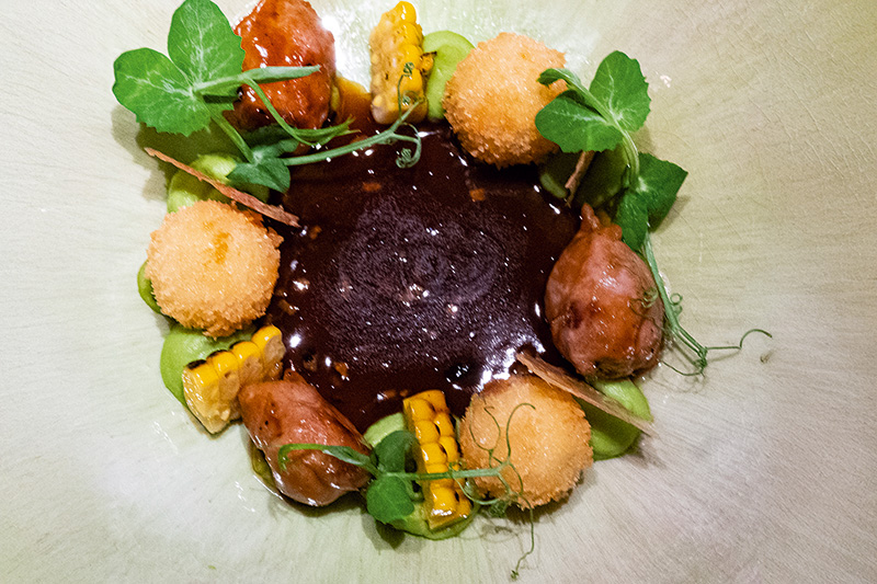 »Ein Narr lässt es liegen« – Sot-l’y-laisse -, das Beste vom Geflügel, die sogenannten Pfaffenstückchen, die hat uns Helge Straub-Schilling als ersten Teil des Riedgockels butterzart zubereitet. Sie sind glasiert mit einer aromatischen Geflügel-Trüffel-Jus, umgeben von intensivem hellgrünen Erbsenpüree zu zartem, süßen Mais, abgeflämmt und als knuspriges Maisgriesklößchen. Dazu knuspern wir Chips aus Hühnerhaut. Ein vorzüglicher Hauptgang – extrem sterneverdächtig –, der begleitet wird vom Bourgogne Rouge La Taupe 2020 aus der Domaine Chavy-Chonet, einem würzigen, dunklen, von Hand gelesenen Burgunder und der zeigt sich zum Essen ganz mild.