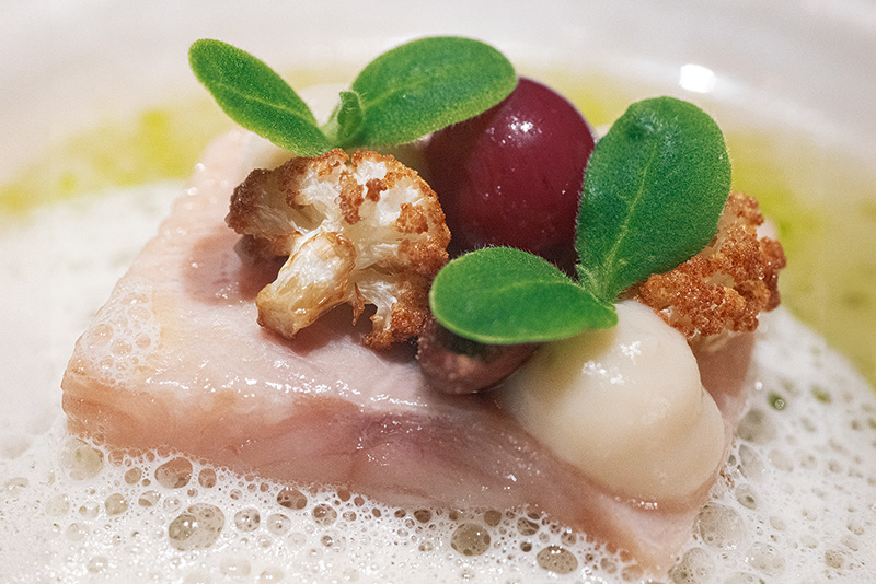 Maike hat uns dazu den eigenwilligen Demeter-Sauvignon Blanc 2023 von Moritz Kissinger aus Uelversheim eingeschenkt. Die ungewöhnlich lange Lagerung auf der Hefe hat ihm die überbordende Fruchtigkeit der bekannten Sauvignon Blancs genommen. Er gefällt uns und gesellt sich hervorragend zum Gemüse. Dem Sellerie ist ein Solo-Auftritt gegönnt. In Salzteig gegart, als Crème und als kräftige Essenz (darin fermentierte Kirschpflaumen aus dem Hotelgarten) paart er sich mit Feigenkompott, mit Pfifferlingen, Roggencrumble und einem Gierschblatt zum trockenen Attila Silvaner 2021 vom Weingut Heiligenblut, der mit seinen alten Reben fast dominierend, aber dennoch harmonisch mit dem Sellerie kämpft. Interessant wird es nun beim Stückchen vom confierten Saibling, der himmlisch zart in Weißweinschaum und köstlichem Petersiliensud ruht. Er zerschmilzt auf der Zunge und begleitet im Mund die schmackhaften Texturen des Blumenkohls, der uns dabei frittiert, als Essenz, als Püree, kombiniert mit Traube, geräucherter Mandel und Borretschkresse begegnet. Eine phantastische, beglückende Komposition! Der klassisch holzig ausgebaute Chardonnay Drei Dörfer 2022 vom Weingut Franz Keller ergänzt den Gang sehr harmonisch – optimal.