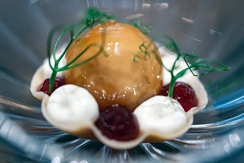 Er gefällt auch zum zweiten Teil des Riedgockels. Da haben wir ein Stückchen der hervorragenden, zarten Brust mit krosser Haut in einer sehr konzentrierten Jus mit Lärchenhonig. Die Lärchentriebe dabei schmecken süß-sauer, die Petersilienwurzel gibt es abgeflämmt, als lockigen Chip und als Crème, die eingelegten Vogelbeeren erfreuen mit ungewohntem neuen Aroma. Auf allen Tellern haben uns regelrechte Kunstwerke begeistert, die neben ihrem Anblick allesamt ungeahnte Aromen bereithielten.