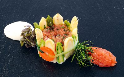 vom Gewürzlachs an kleinem Kräutersalat Die Spargelreste fein würfeln und mit Salz, Pfeffer und Olivenöl marinieren. Die Spargelspitzen kurz blanchieren und längst halbieren. Den Gewürzlachs fein würfeln und mit Olivenöl marinieren. Bisquitboden Rund ausstechen. Die… weiterlesen…